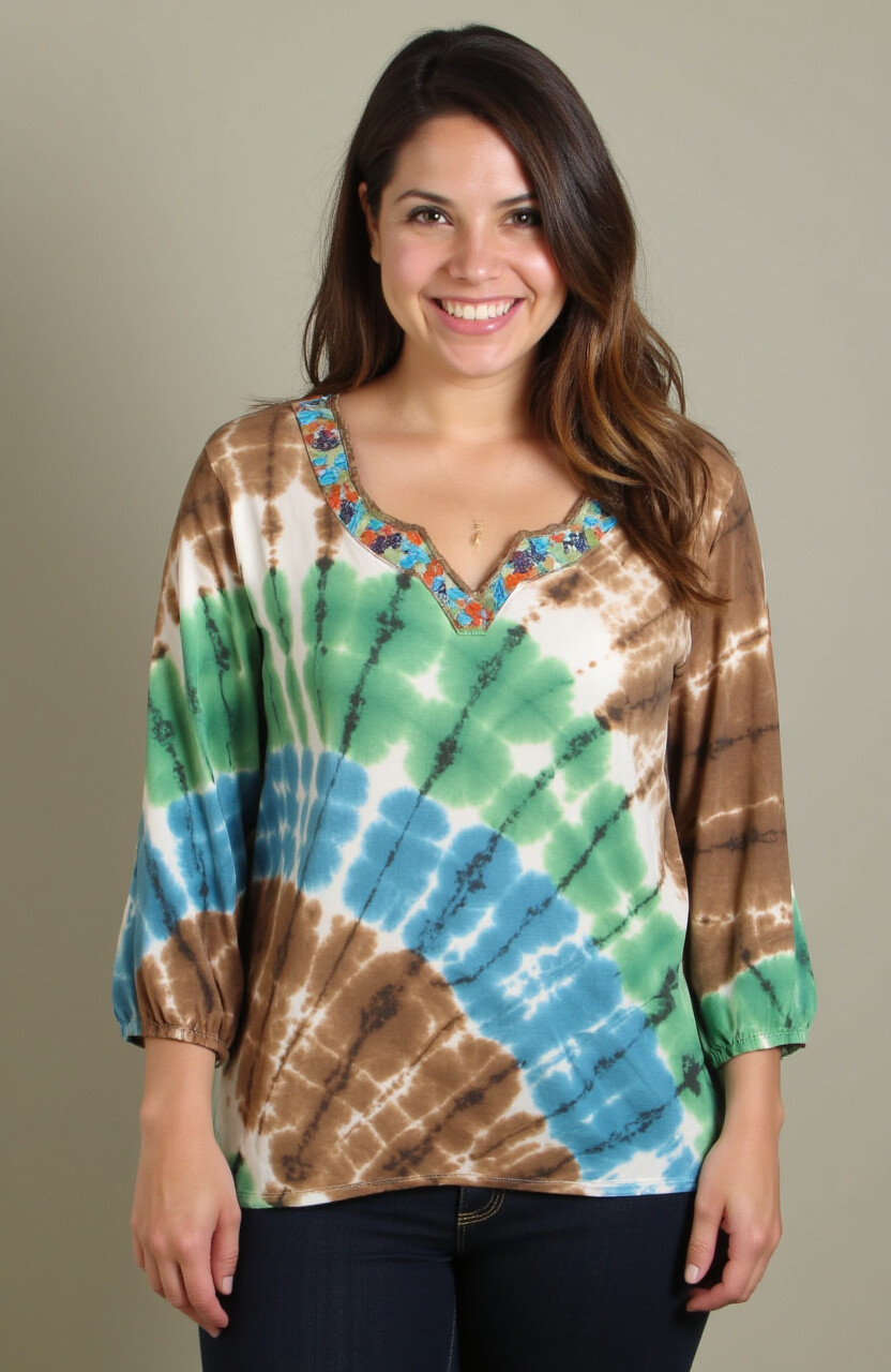 Tie-dye blouses can make a bold style statement. The earthy tones of brown, green, and blue create a natural, grounded look. It’s a style that resonates with a love for nature and creativity.