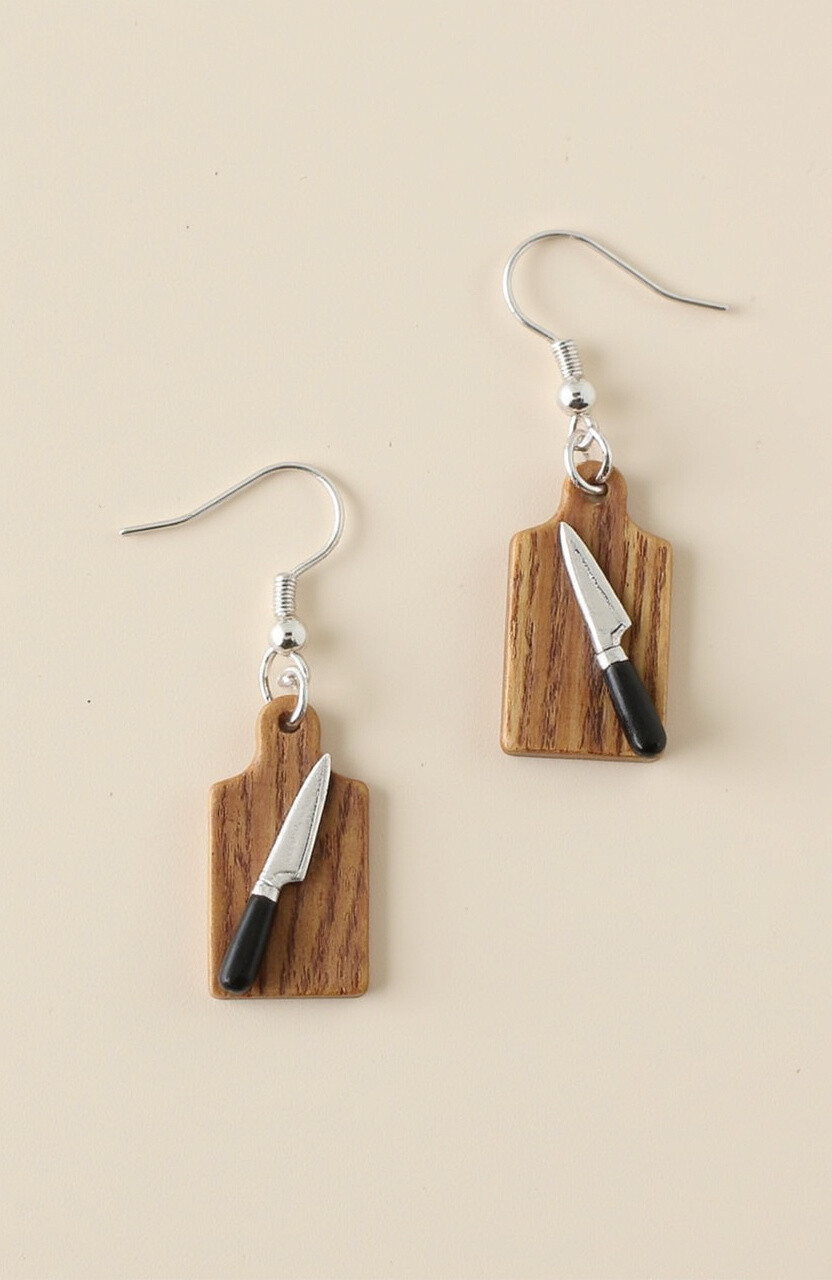 These earrings feature a mini chef’s knife and cutting board, perfect for the serious cook. They show off your skills without needing words.