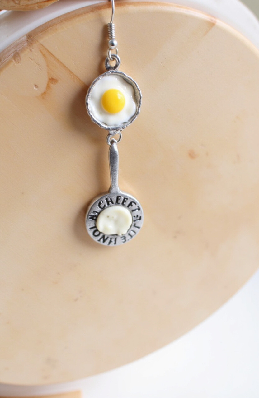 These egg and pan earrings are the perfect breakfast companion. The tiny fried egg sits perfectly in the miniature pan.