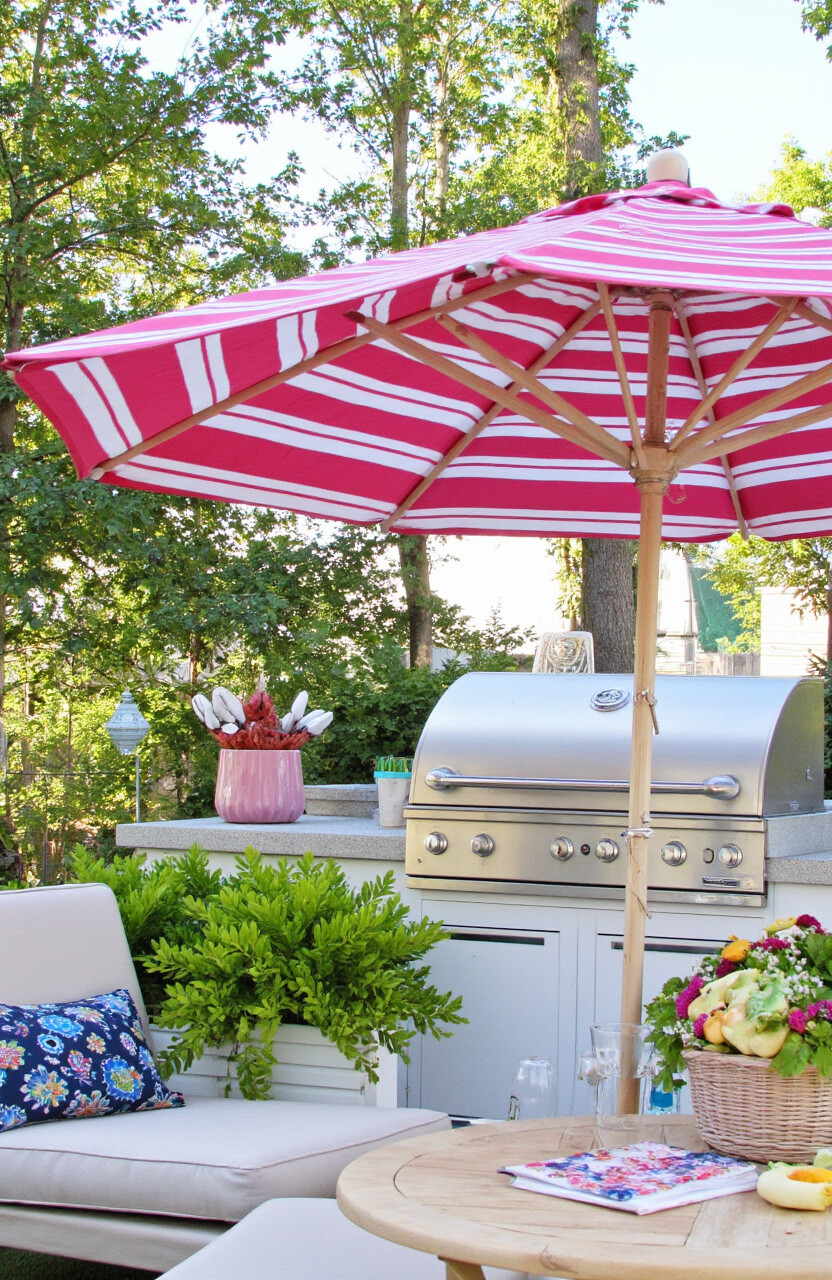 A colorful beach umbrella provides shade and a pop of color. It feels like a day at the seaside, right in your backyard.