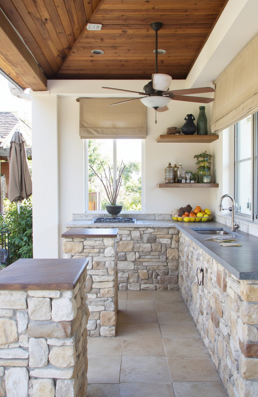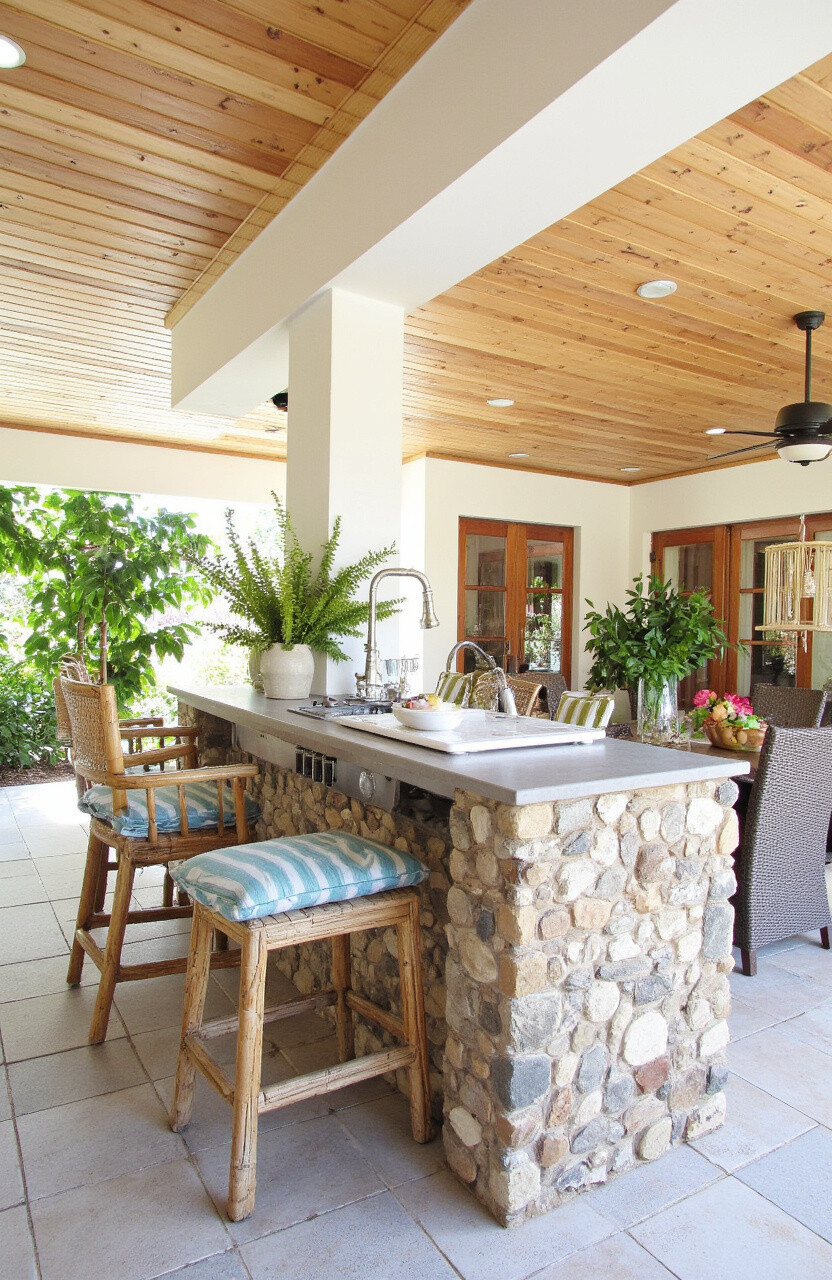 Weathered wood looks like it’s been sun-kissed and wave-tossed. It’s perfect for an outdoor kitchen that’s all about that beach vibe. The worn look is cozy and inviting.