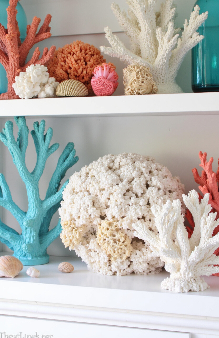 Coral pieces can be found at home stores. They’re usually affordable. Pair with seashells for a cohesive look.
