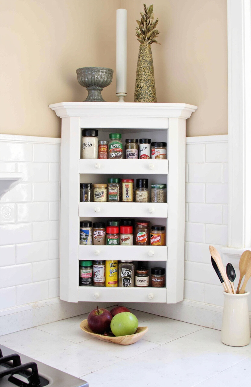 A corner spice rack keeps your spices organized and within arm’s reach. Whether you choose a mounted or free-standing rack, it adds a touch of elegance to your kitchen.