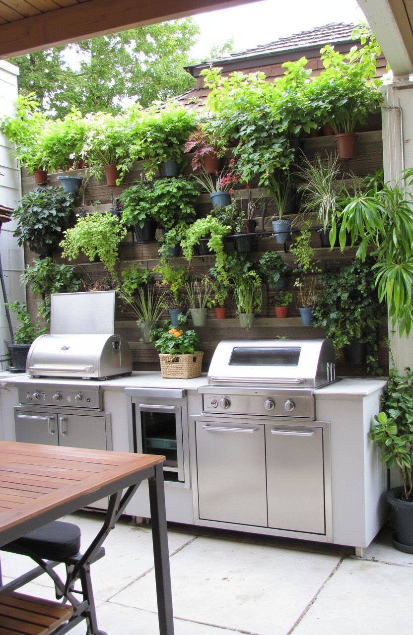 Transform a plain wall into a vertical garden. Use it to grow herbs and small vegetables, making your cooking experience fresher and more rewarding. Vertical gardens save space and add a lush, green backdrop to your patio kitchen.