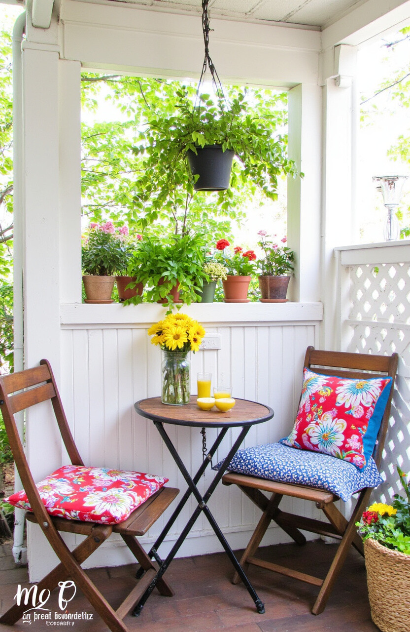 Create a snug little corner with a small table and chairs, perfect for sipping your morning coffee. Use vibrant cushions to add a dash of color. This setup feels welcoming and makes great use of a tight space.