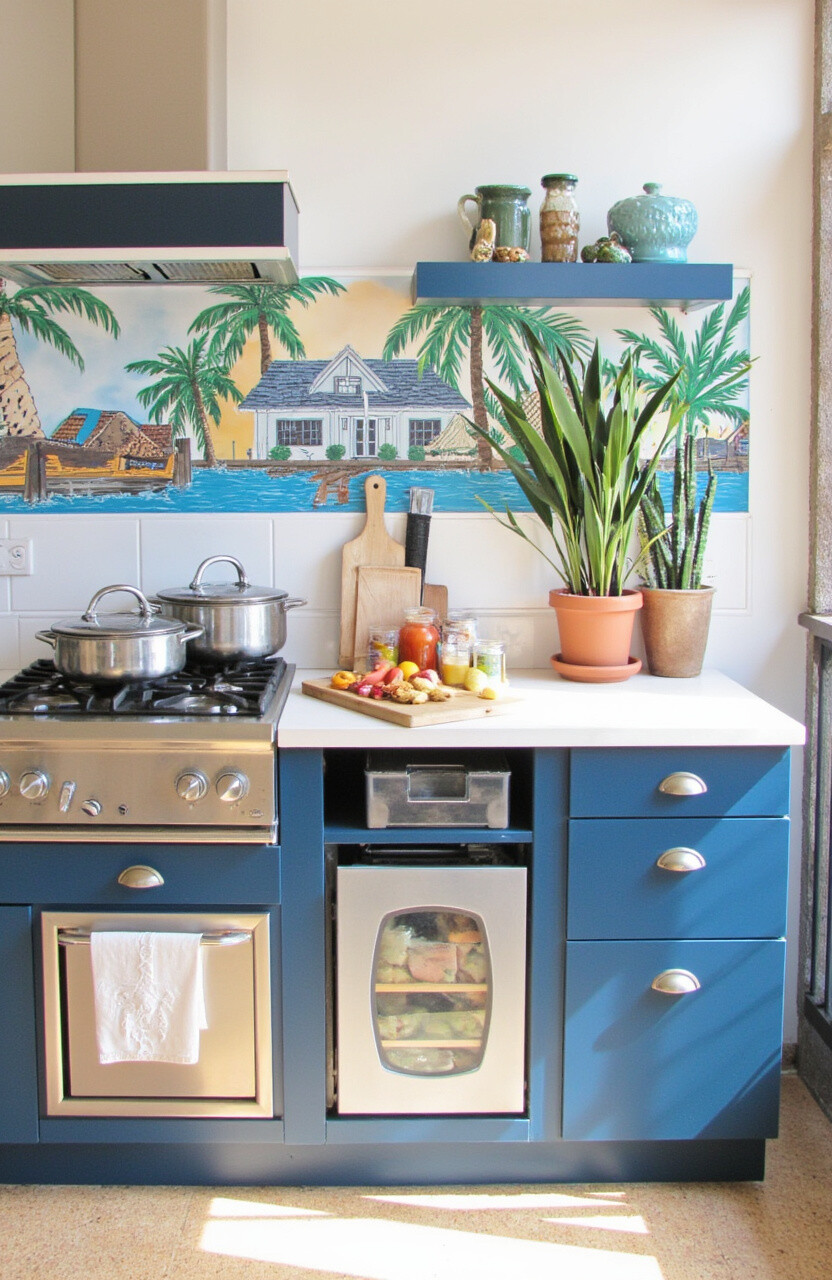 Bring art to your patio kitchen with a stunning wall mural. Choose a design that reflects your style, whether it’s a tropical scene or an abstract pattern. Wall murals turn a plain wall into a captivating feature.