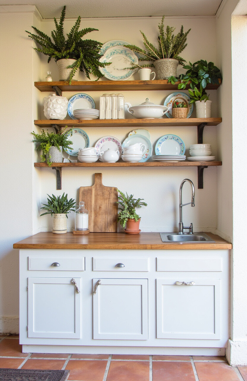 Install rustic wooden shelves to store your kitchen essentials. These shelves offer a warm, earthy feel and are perfect for displaying beautiful dishware or potted plants. Wood’s natural texture adds a cozy vibe to any space.
