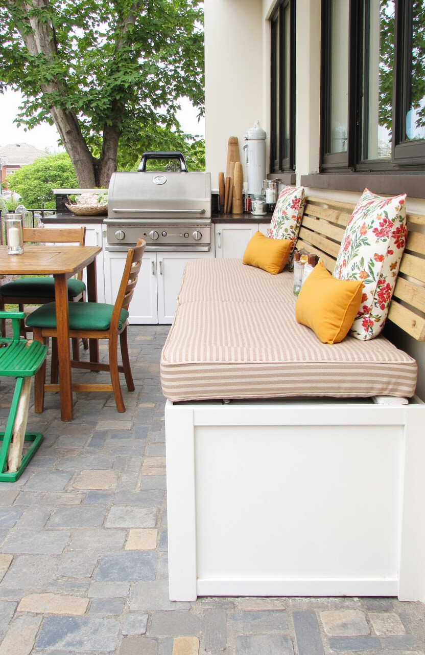 Built-in seating can make your patio kitchen more comfortable and inviting. Benches with storage underneath offer a clever way to save space. This setup is perfect for casual gatherings or family meals.