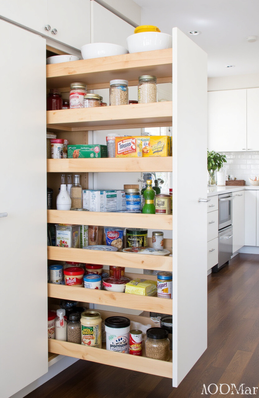 Hidden storage is a game-changer, and pull-out pantry drawers are at the top of the list. They allow you to see all your ingredients at once, making cooking a breeze. It’s like having a mini-market in your kitchen!