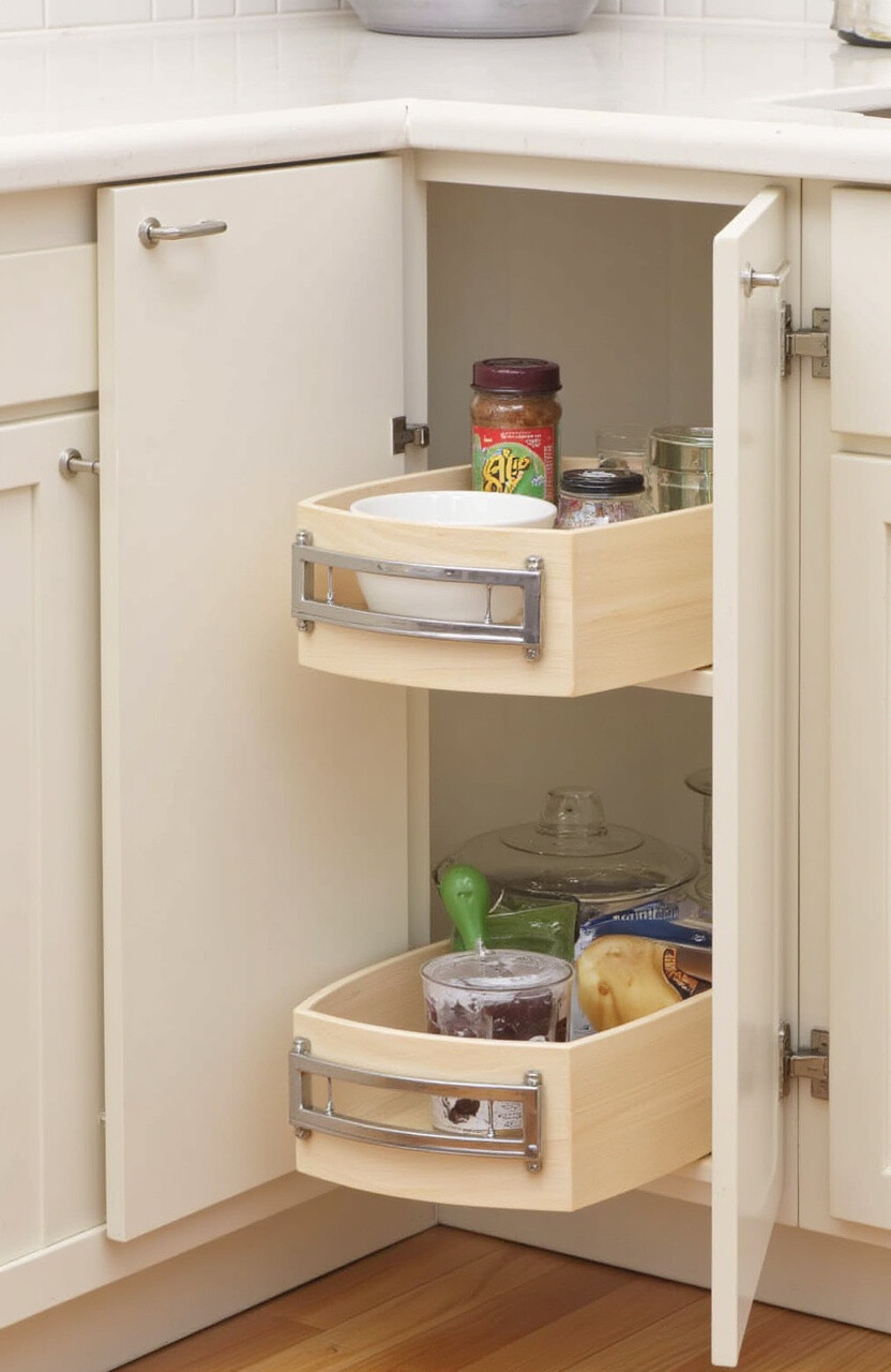 A lazy Susan cabinet insert makes use of deep corner cabinets. It rotates for easy access to items stored in the back.