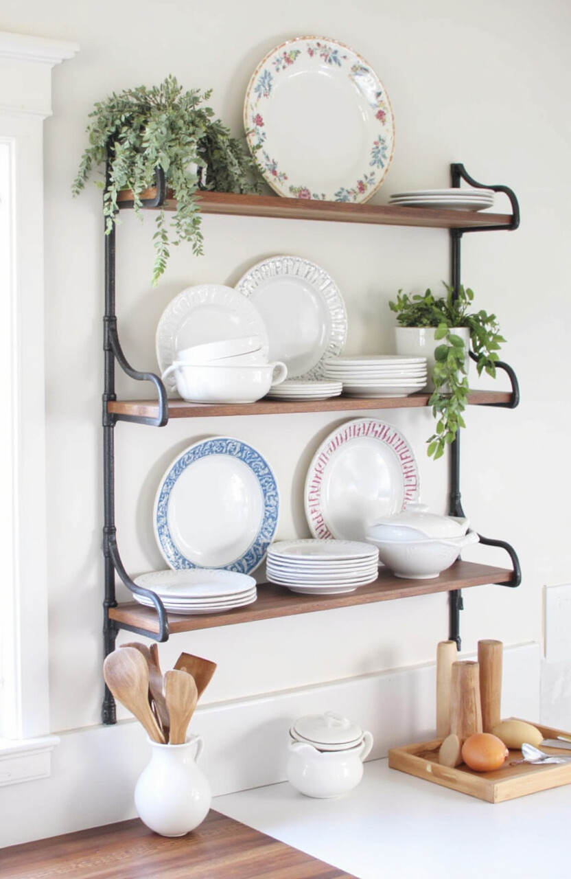 Tiered shelving units create vertical storage, making use of every bit of wall space. They hold everything from spices to dishes, keeping them organized and within reach.