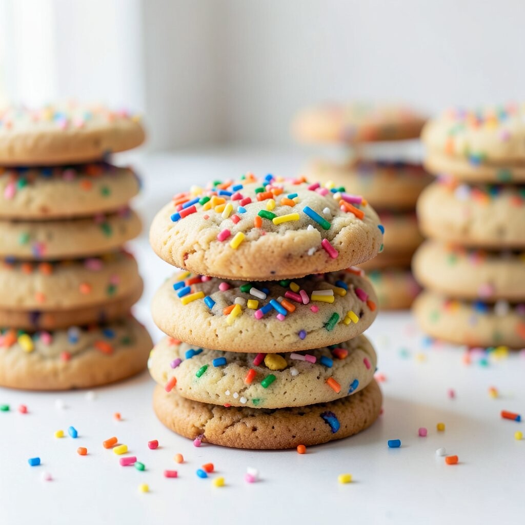 Bright and colorful, this stack is a feast for the eyes and the taste buds. Each layer bursts with vibrant rainbow sprinkles that add a playful touch.