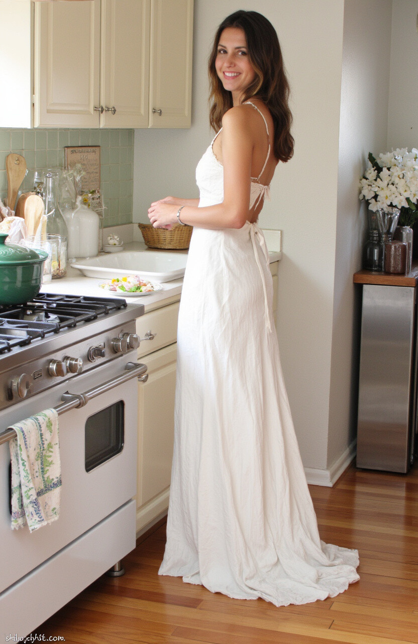 A maxi dress in the kitchen might sound unusual, but it’s a beautiful choice for those who love a flowing, elegant style. Choose a dress with a simple, classic design that allows for easy movement.