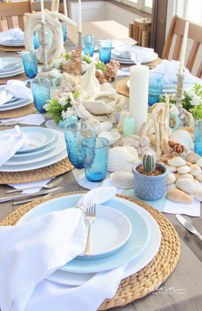 Bring the ocean to your table with a coastal theme. Use blues, whites, and sandy tones, complemented by seashells and driftwood. This setup is like a mini-vacation by the sea.