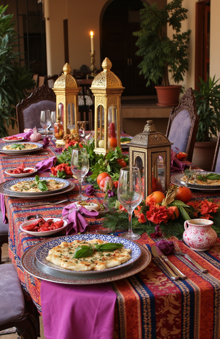 Transport your guests to Morocco with an exotic table setting. Use rich colors, intricate patterns, and lanterns. It’s perfect for adventurous spirits.