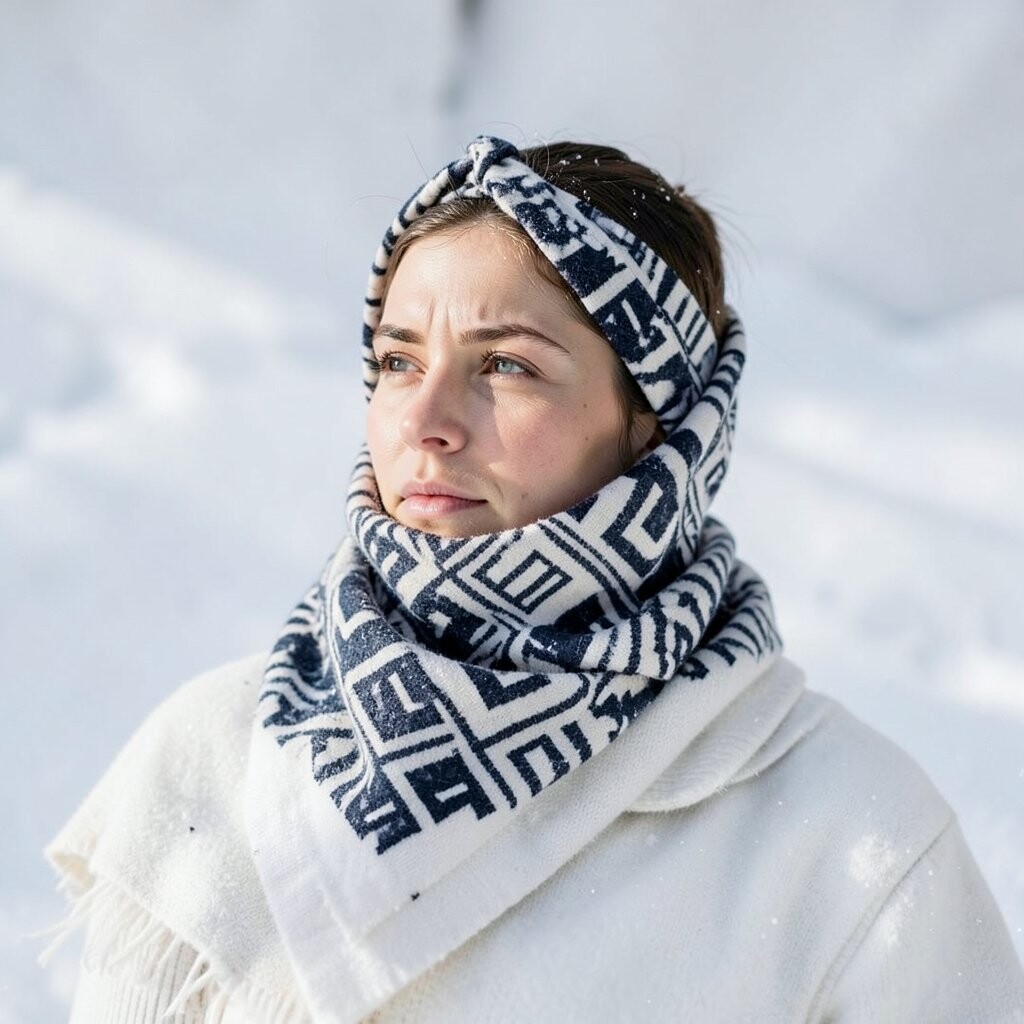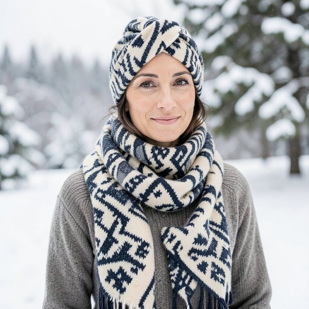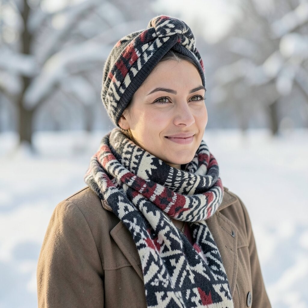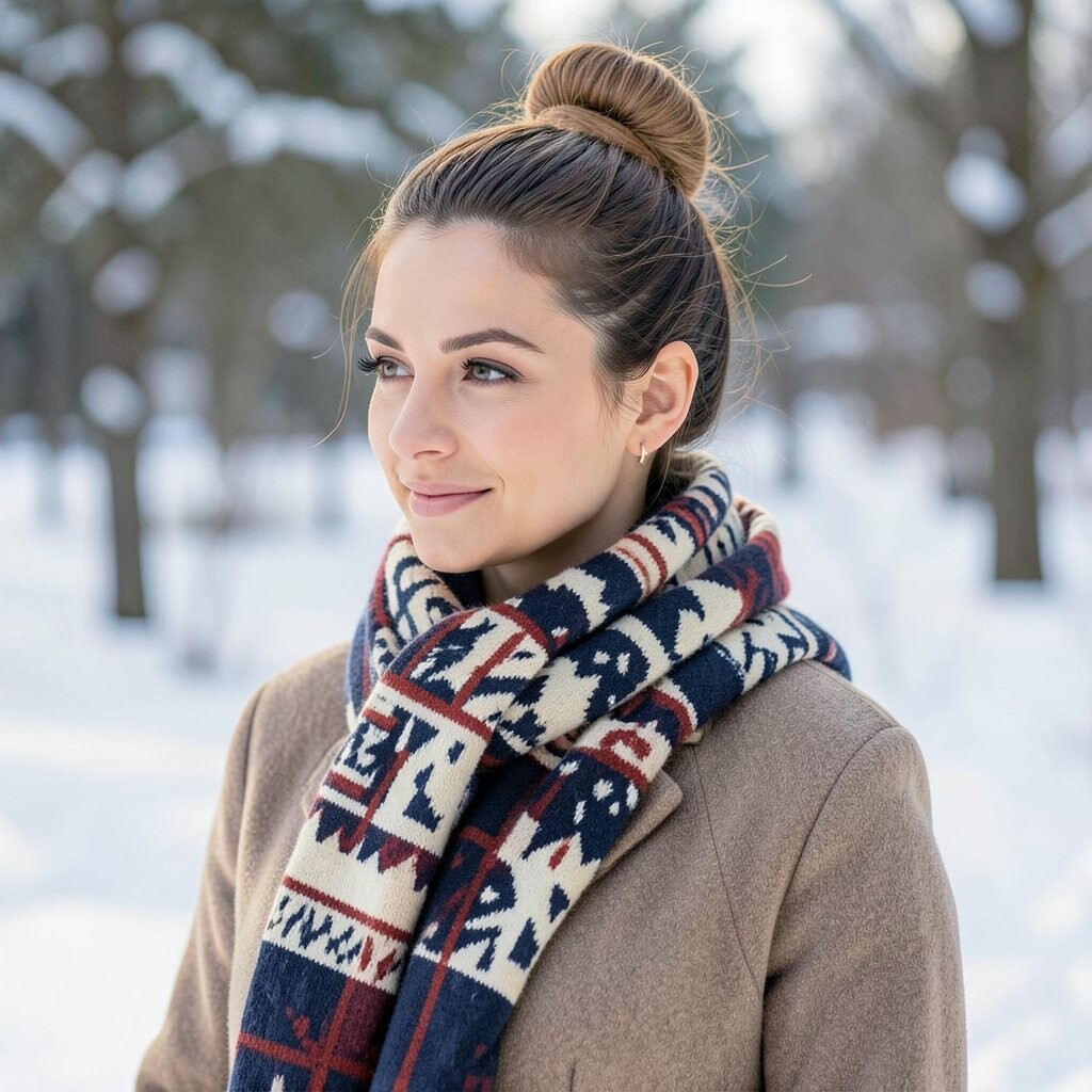 The geometric patterns give it a playful touch. It’s perfect for those who love an updo with a twist. Plus, it keeps your neck warm!