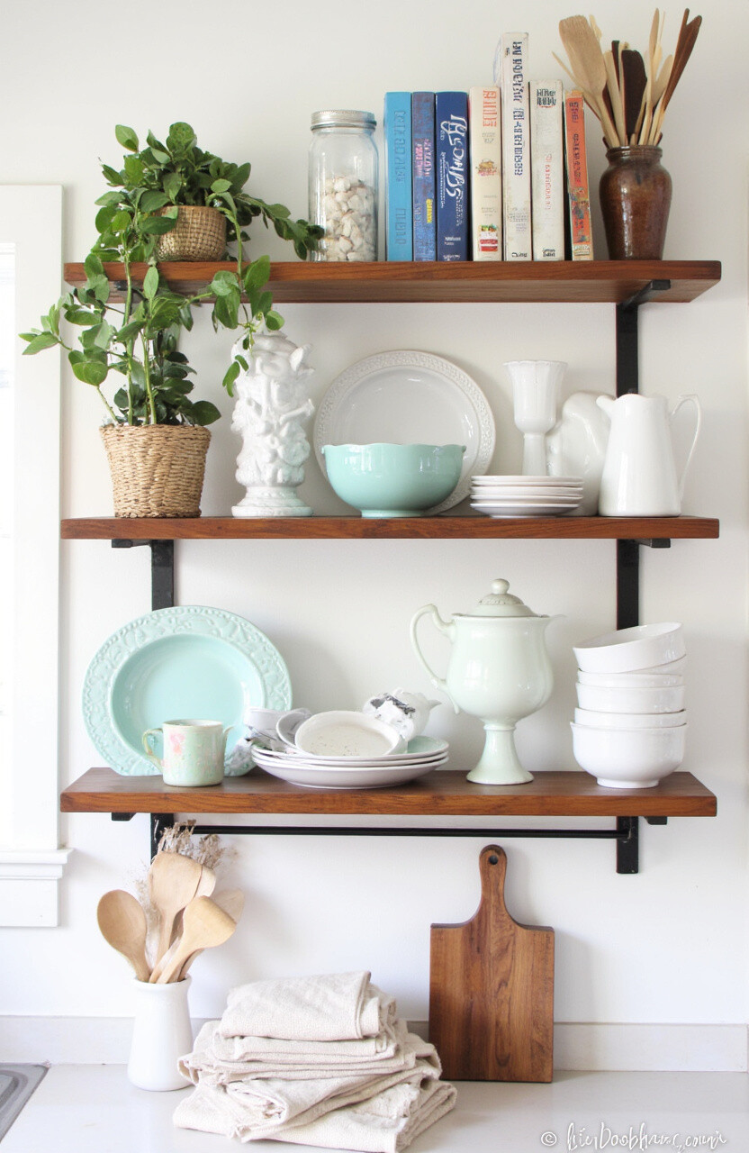 Opt for wooden shelves to keep with the rustic theme. They are budget-friendly and can be customized to fit your space. Open shelving encourages you to keep your kitchenware organized and aesthetically pleasing.
