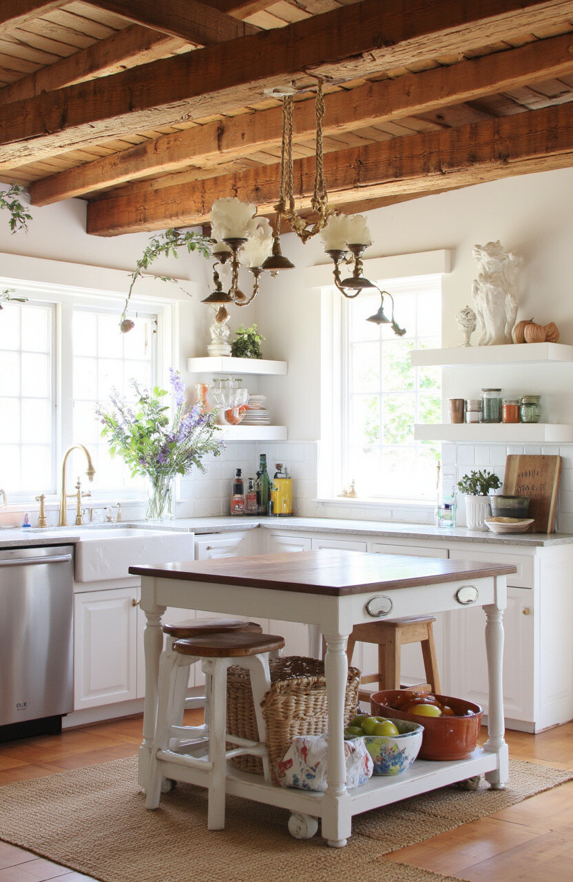 Adding wooden beams to your kitchen ceiling can give the room a rustic, cozy feel. They add architectural interest and can make the space feel larger by drawing the eye upward. Choose salvaged wood for an authentic, eco-friendly option.