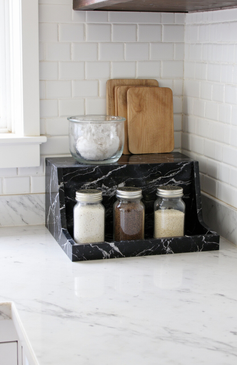 A dark marble spice rack adds sophistication to your countertop. It keeps spices organized and within reach.