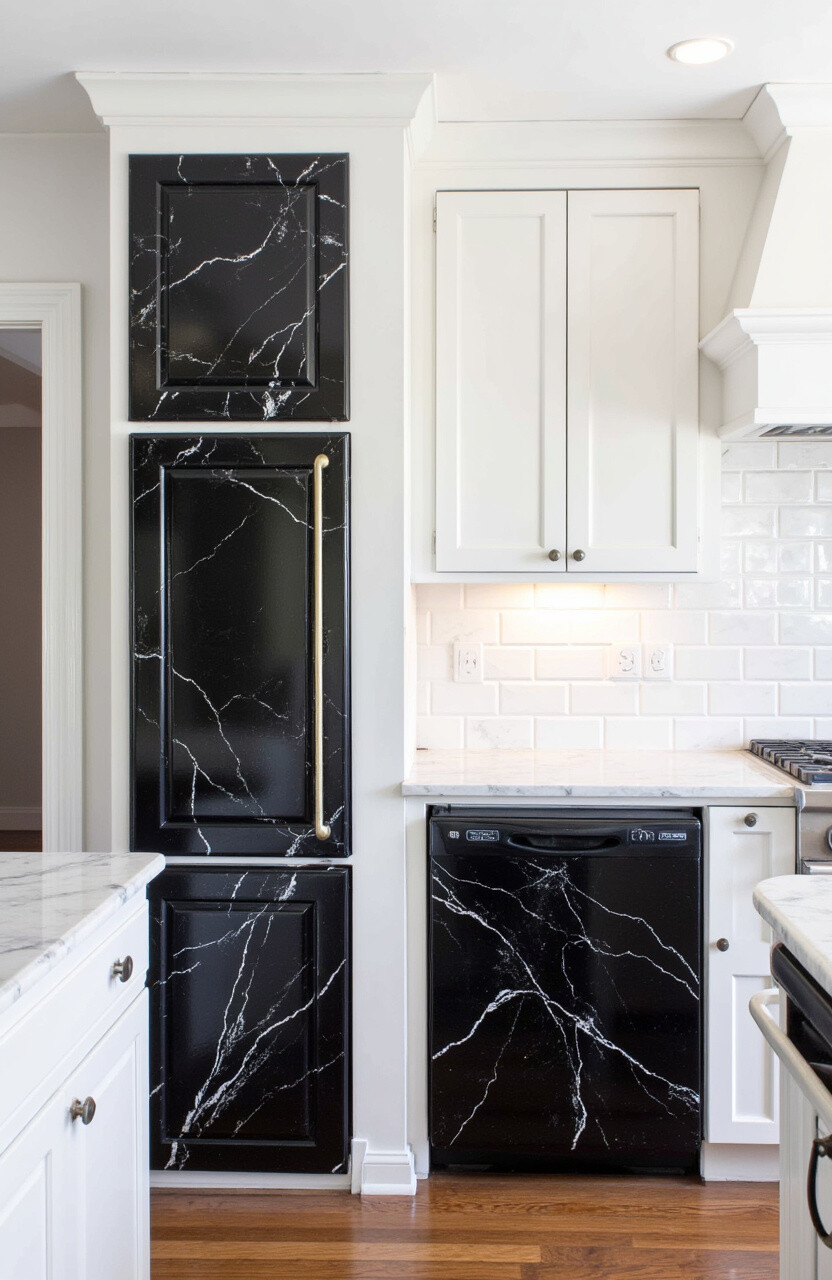 Covering appliances like your fridge or dishwasher with dark marble panels can create a cohesive look. It seamlessly integrates them into your kitchen design.