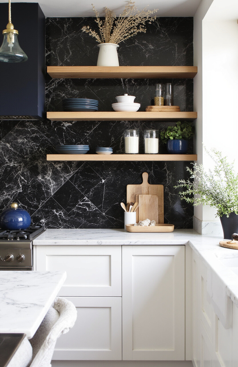 Using dark marble for shelf ledges adds a layer of sophistication to open shelving. It’s a chic way to display your favorite kitchenware.