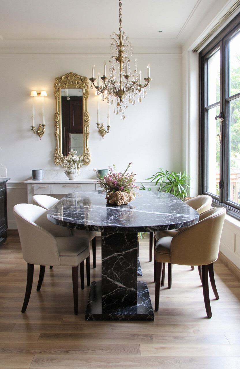 A dark marble dining table is a statement piece that draws everyone’s attention. It’s perfect for hosting elegant dinners.