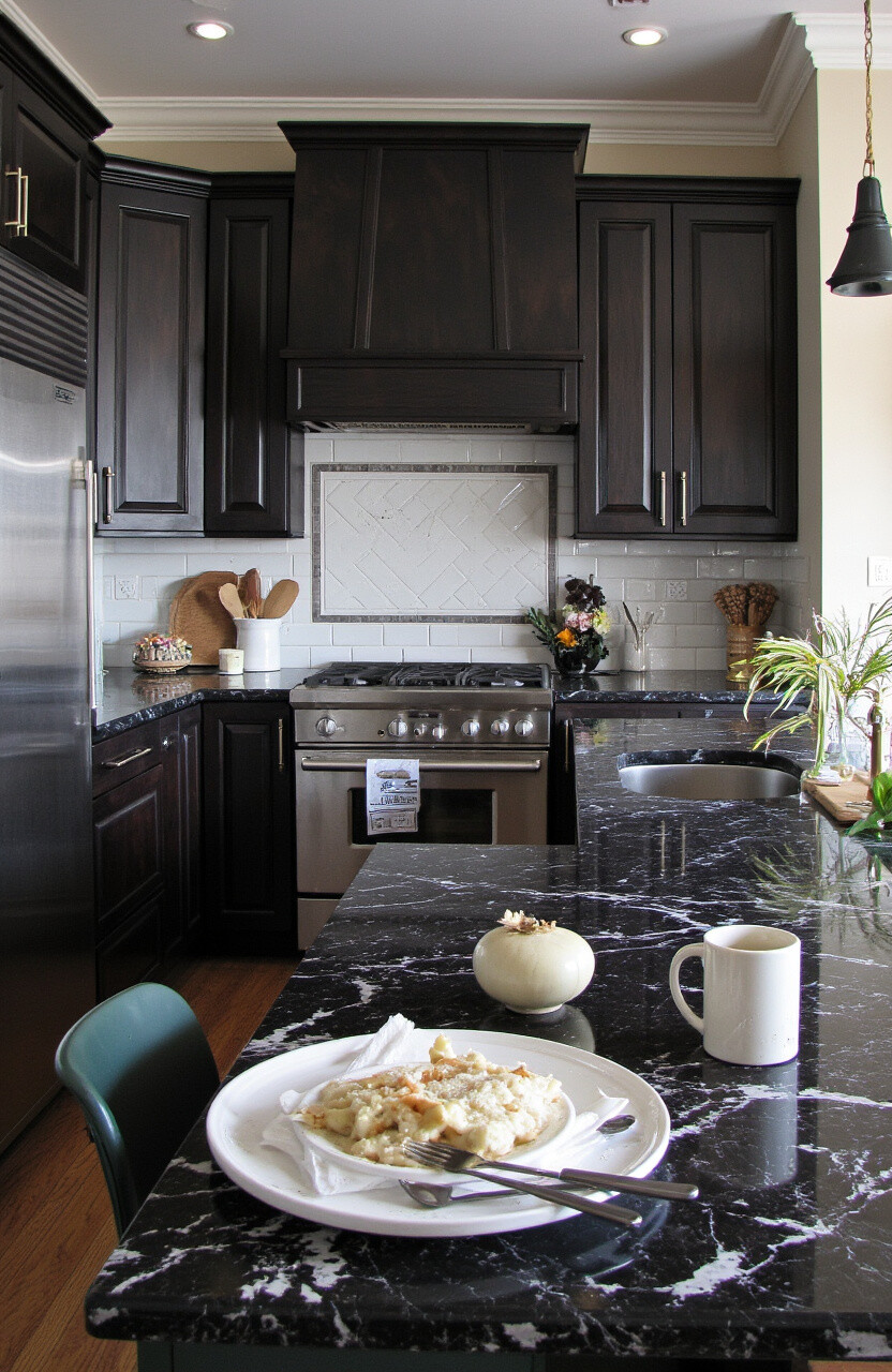 A dark marble backsplash can be the focal point of your kitchen. It creates depth and contrast against lighter cabinetry.