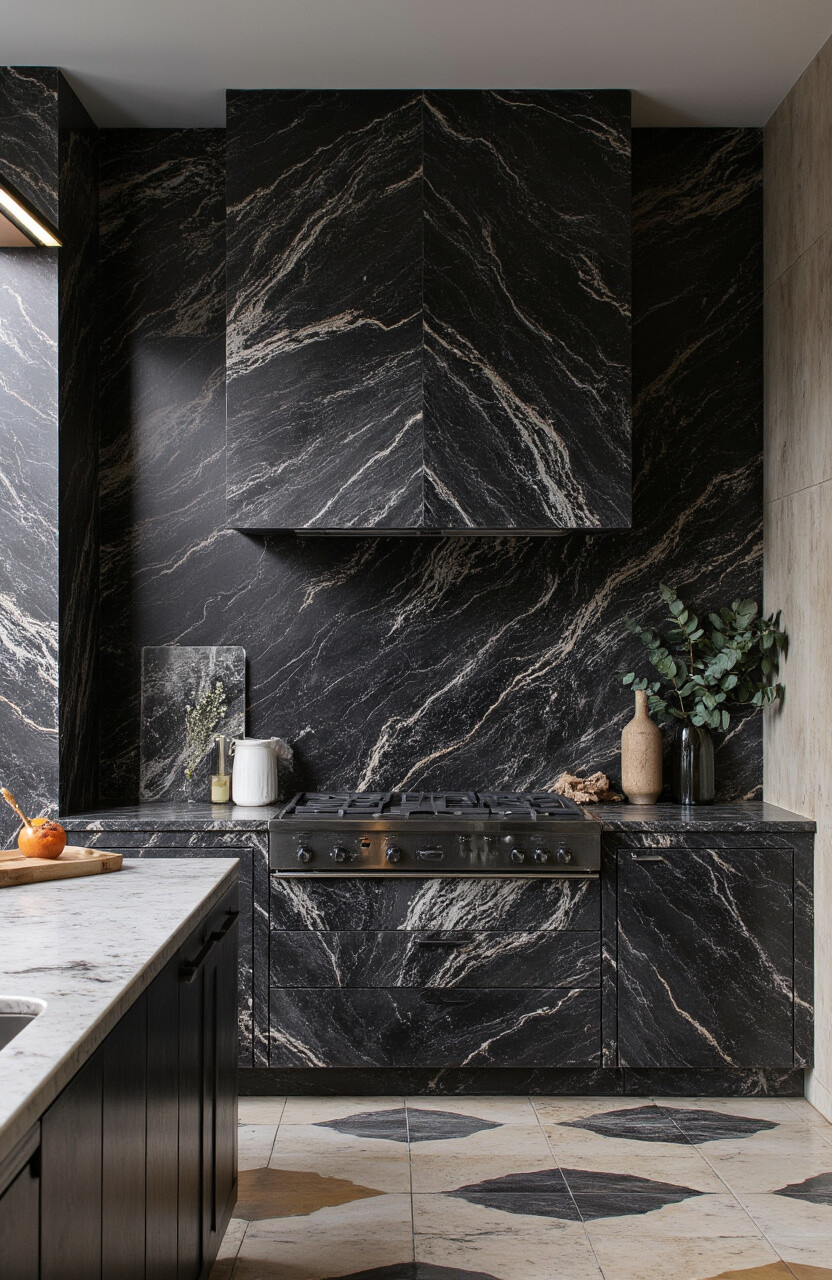 Cover a feature wall with dark marble for a dramatic effect. It turns your kitchen into an art gallery.