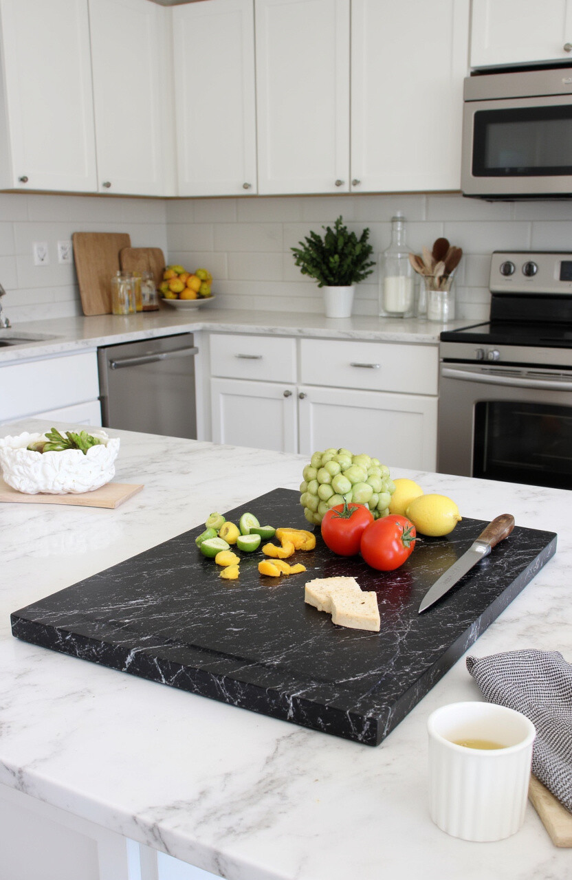 A dark marble cutting board makes food prep feel luxurious. It’s a practical yet stylish addition to your kitchen.