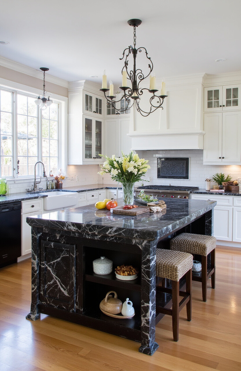 Creating a kitchen island with dark marble can make your kitchen feel like a high-end restaurant. It’s an excellent spot for both cooking and socializing.
