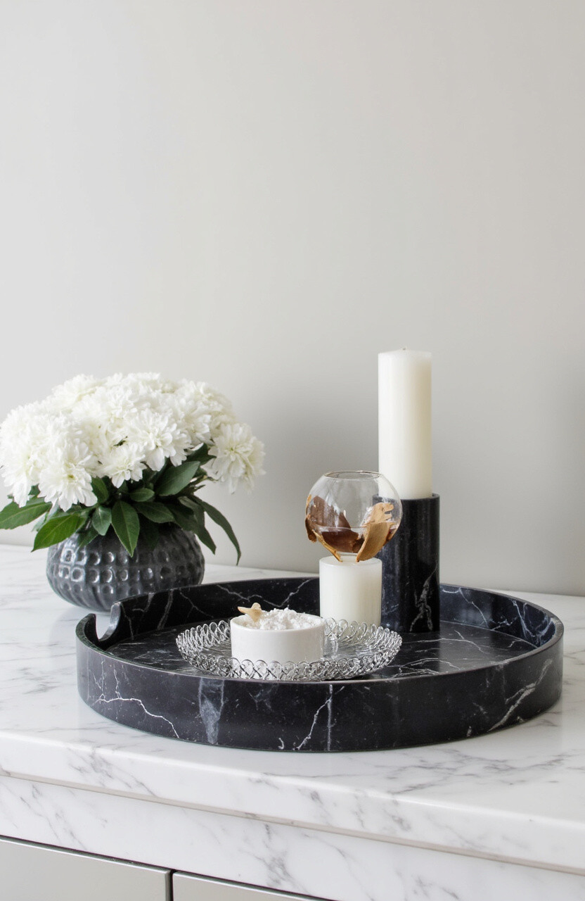 Marble trays are a cost-effective way to introduce marble into your kitchen. Use it to serve drinks for a touch of elegance.