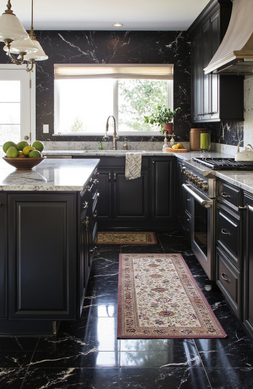 Dark marble flooring can transform your kitchen into an elegant space. It’s like walking on a piece of art every day.