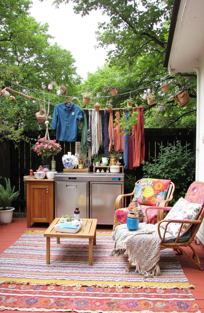 A bohemian deck setup is all about comfort and creativity. Picture colorful textiles, hanging plants, and eclectic decor.