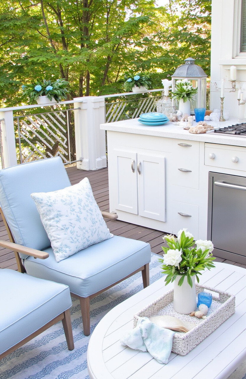Bring the cool, calming vibes of the coast to your deck with a coastal-inspired setup. Think soft blues, whites, and natural textures.
