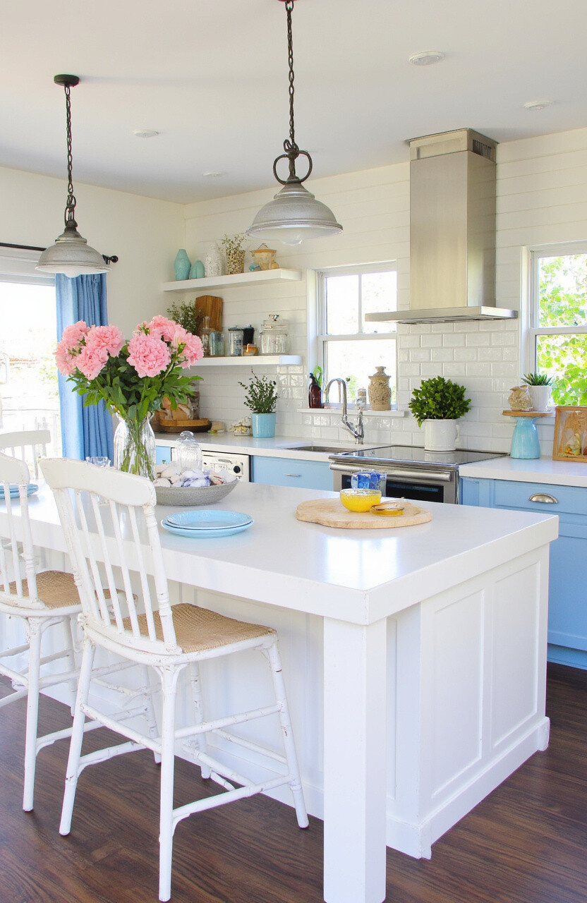 Think of a breezy beach house with white and blue colors. A coastal kitchen feels refreshing and calming.