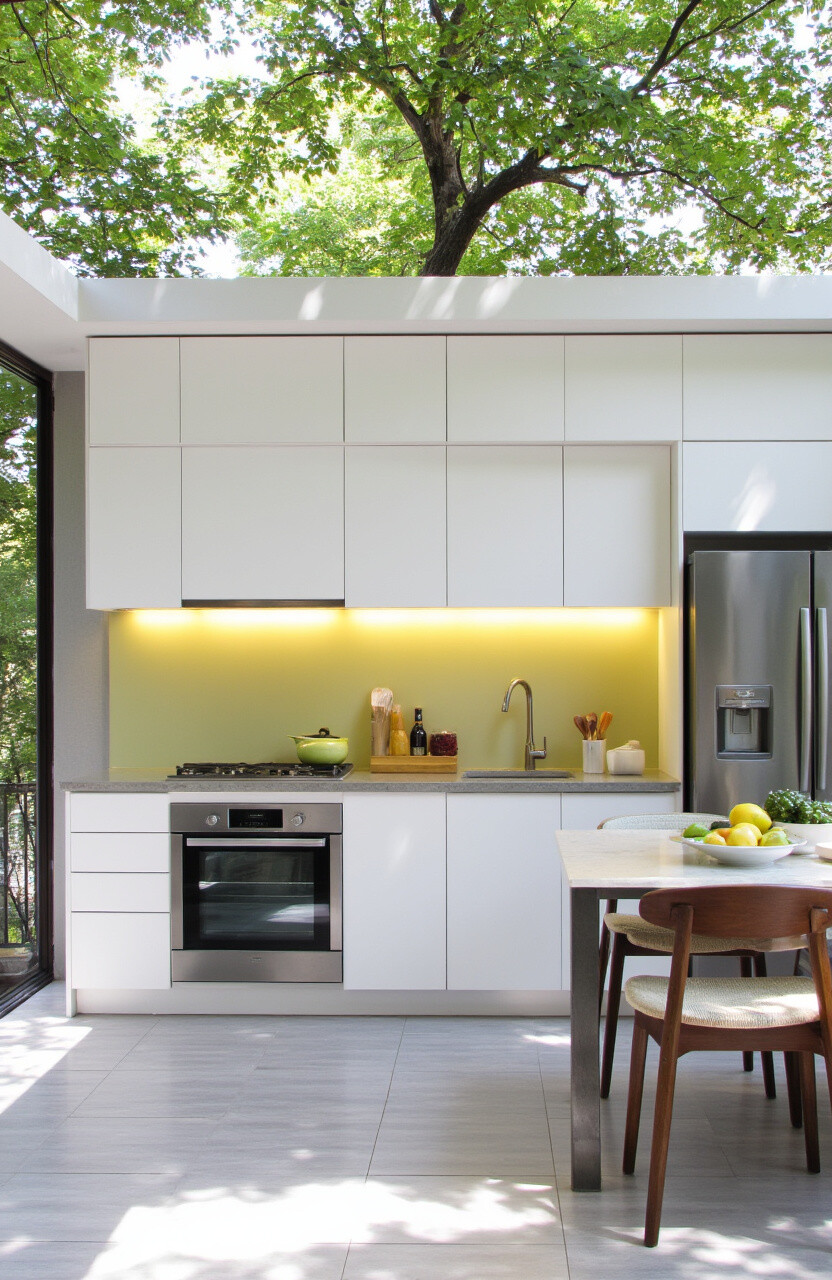 Clean lines and simple designs define this kitchen style. Picture sleek countertops and stainless steel appliances under a canopy of trees.