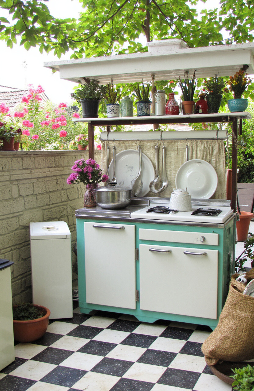 A vintage kitchen is a step back in time with retro appliances and nostalgic decor. It’s like cooking in your grandma’s kitchen but outside.