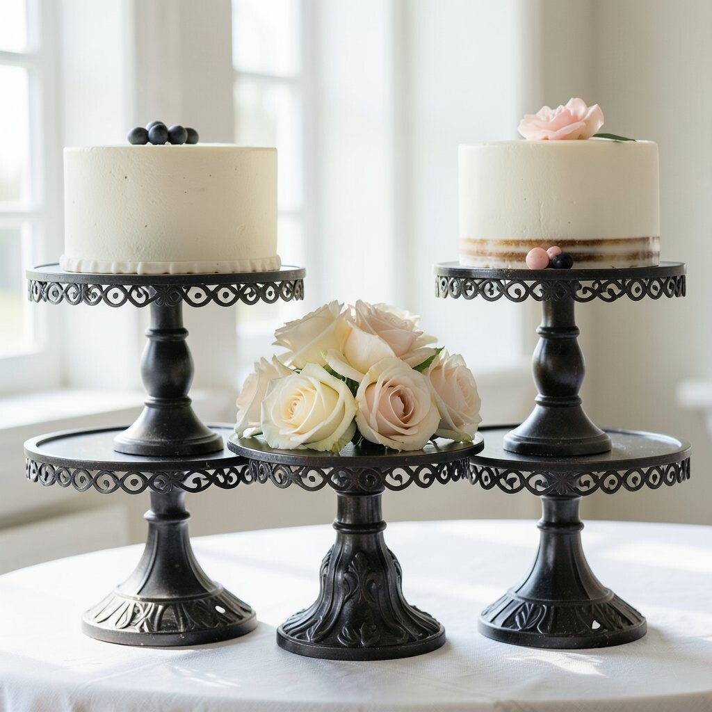 Sleek and simple, a metal cake stand fits right into a modern or industrial theme. It’s like a piece of art holding your cake. Ideal for urban settings or contemporary weddings.