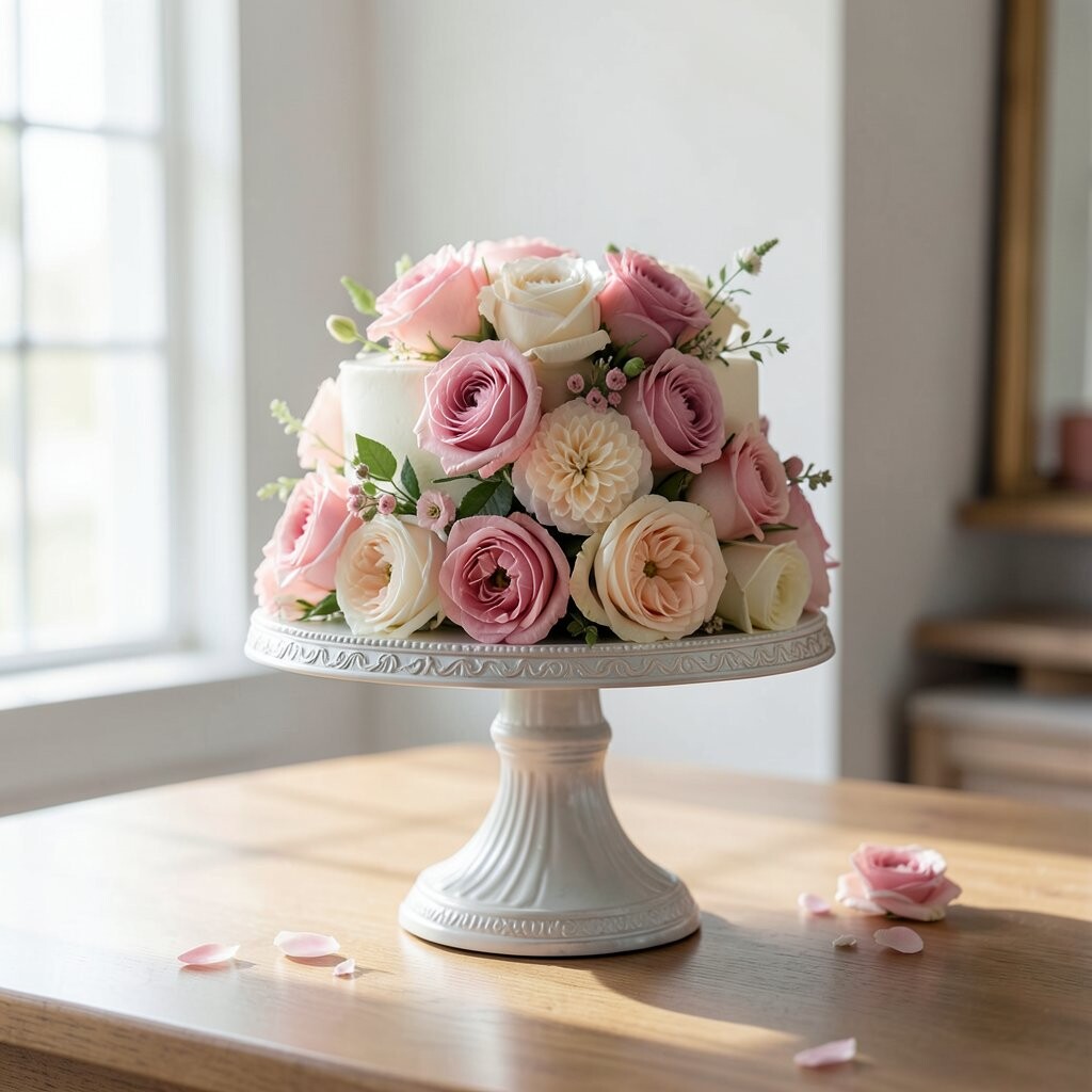 Imagine a cake stand adorned with delicate flowers. Perfect for spring or garden parties. It’s like having a bouquet under your cake.