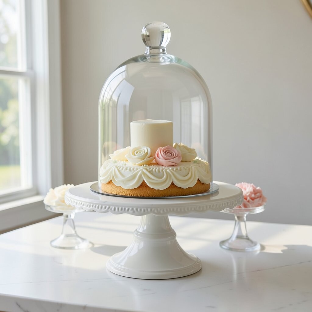 Picture a clear glass dome over a pastel-colored base. It’s like a little world for your cake, adding an elegant touch to weddings or baby showers. The see-through design lets your cake shine while keeping it fresh.