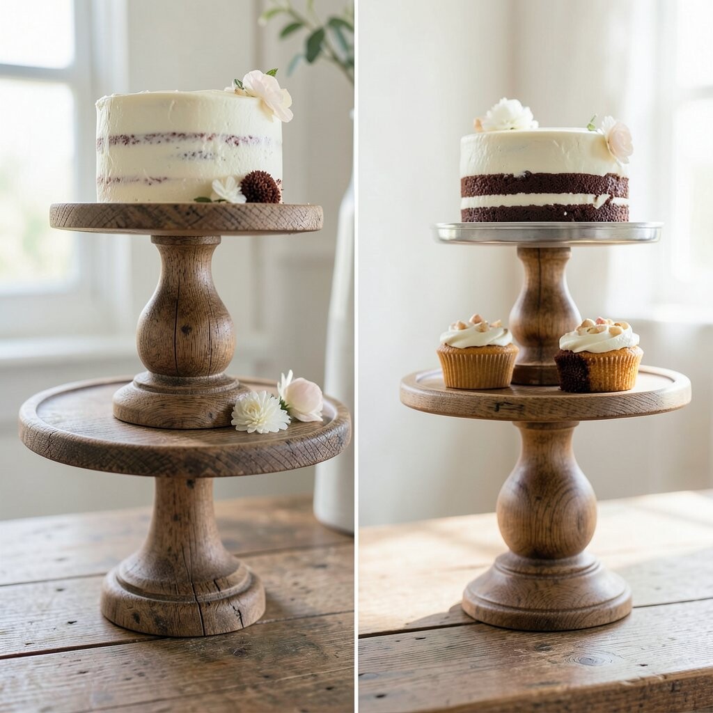 For a natural, earthy vibe, a wooden cake stand is perfect. It’s like bringing a piece of the forest to your table. This stand is ideal for outdoor weddings or garden parties.