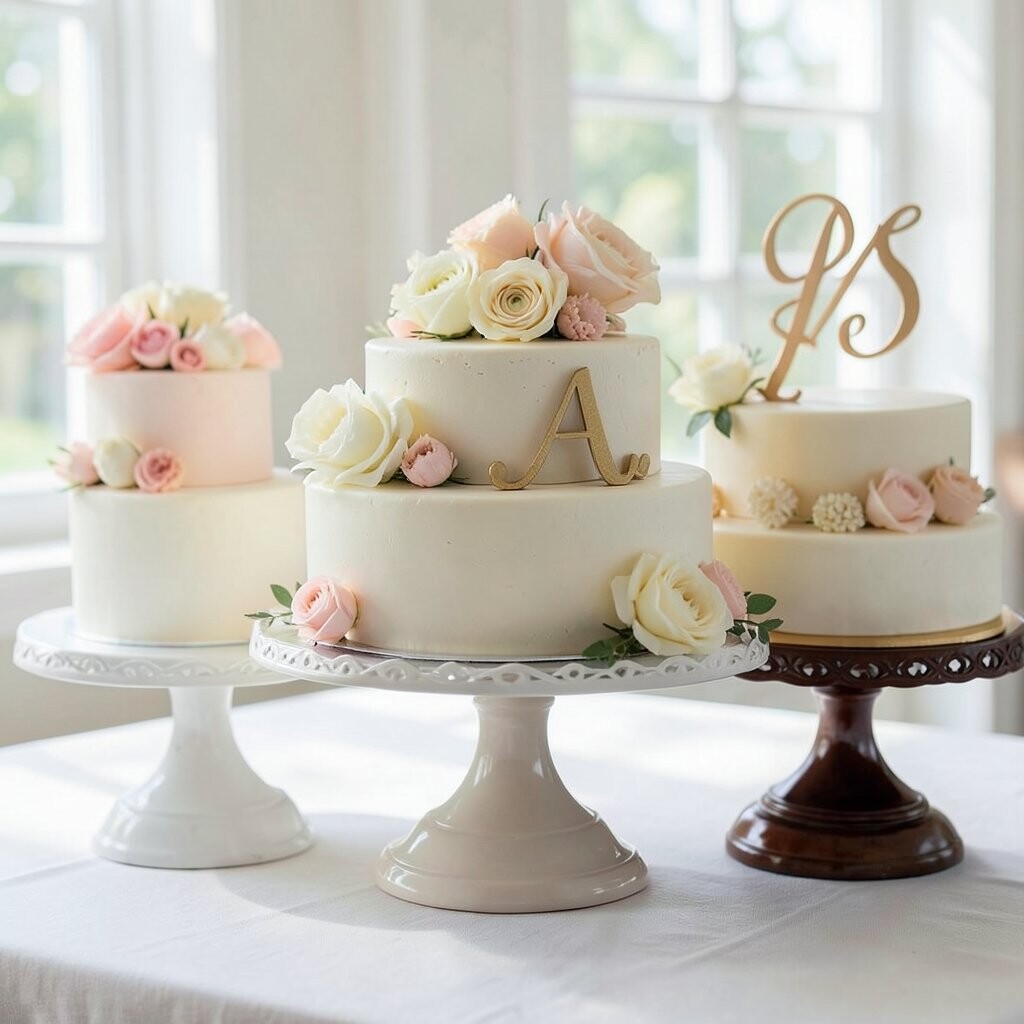 White porcelain stands are like a blank canvas for your cake. Perfect for any theme or color scheme. It’s like a fresh start for your dessert.