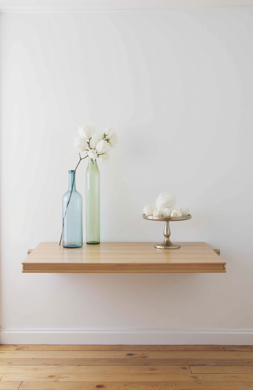 Floating tables are mounted to the wall, saving space. They’re modern and minimalist.