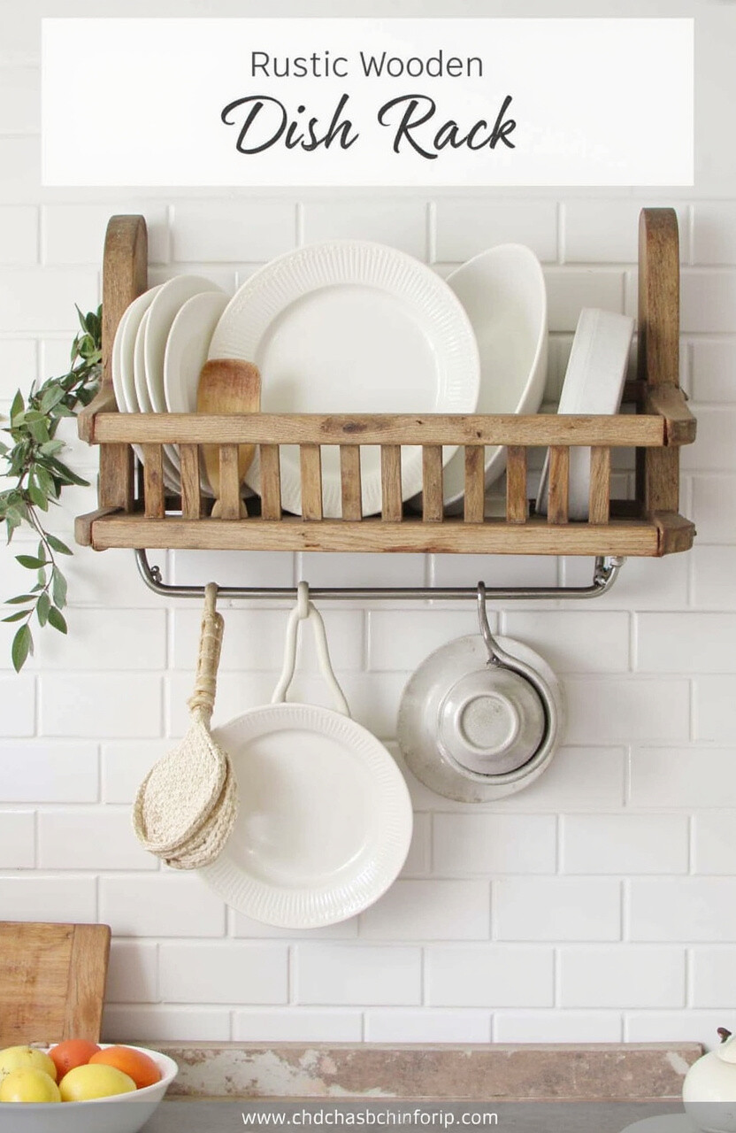 Embrace the charm of a rustic wooden dish rack. It adds a cozy, country feel to your kitchen.