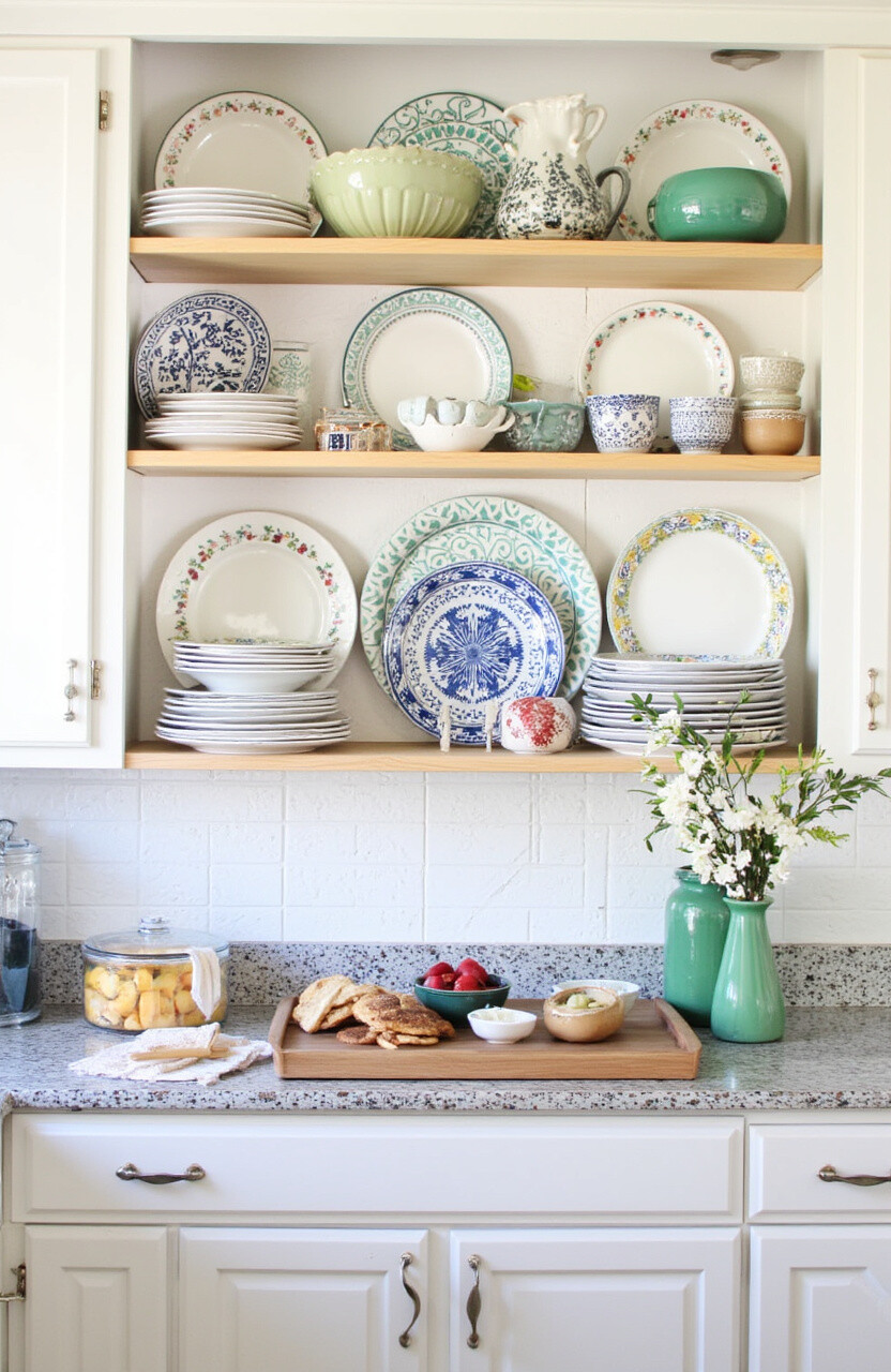 Use wall shelves or open cabinets to arrange your dishes like a gallery. Choose plates with interesting patterns or colors.