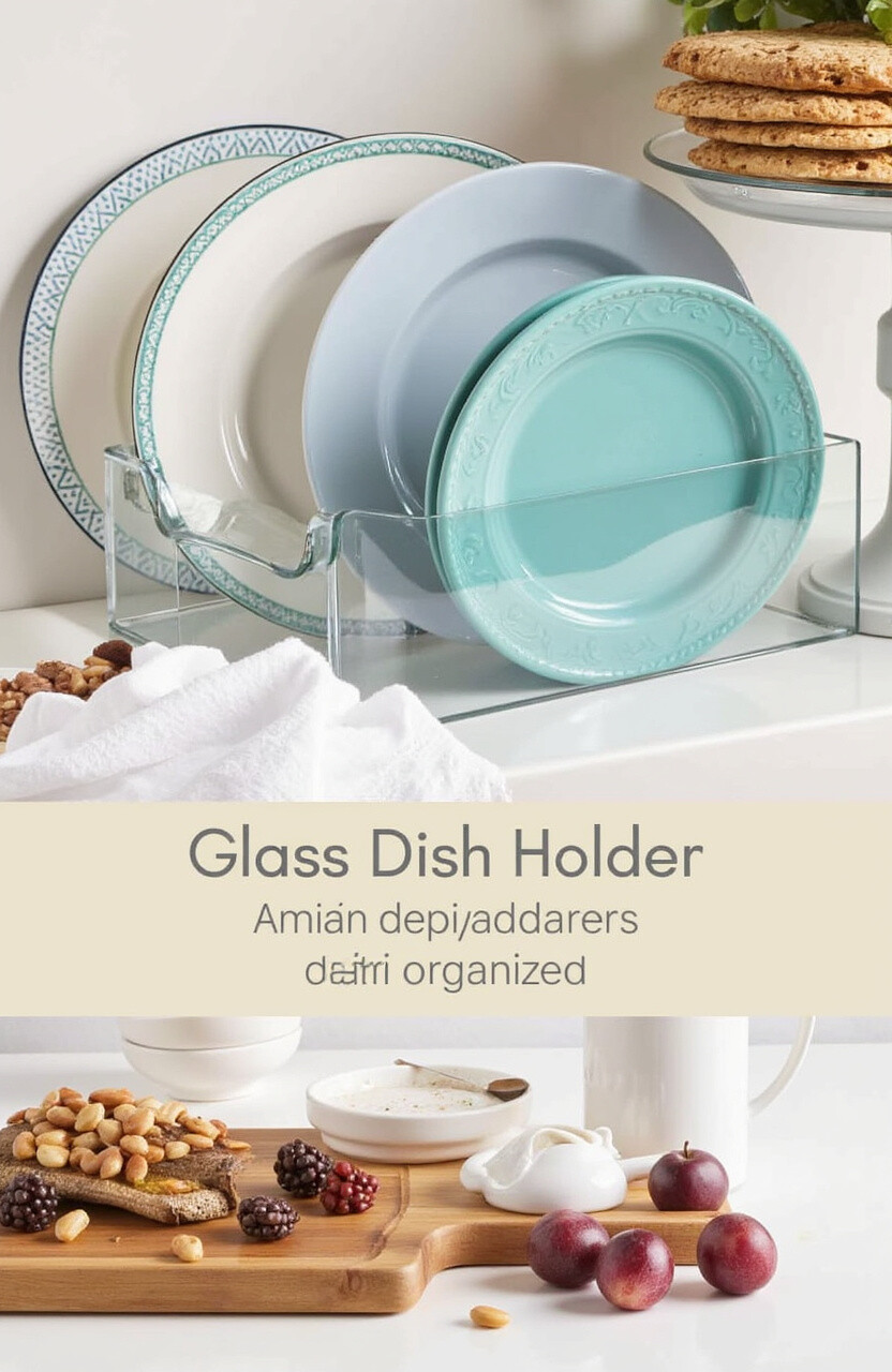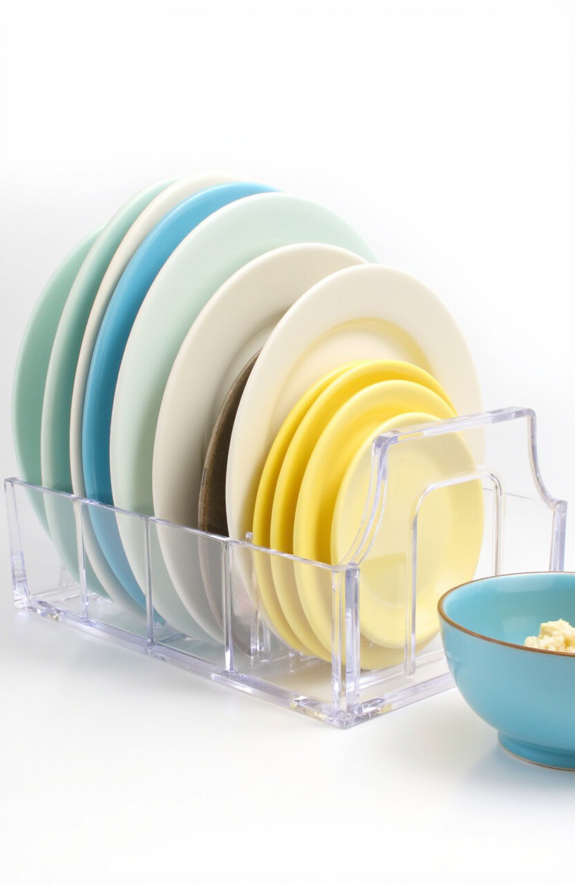 For a modern, sleek look, try an acrylic dish organizer. It’s clear and stylish, letting your dishes be the star.