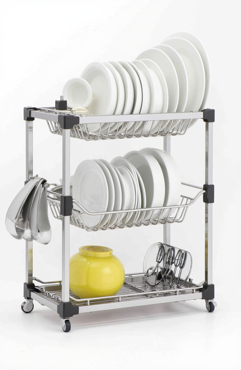 Think of a tiered dish rack like a mini apartment for your dishes. It has multiple levels, so you can stack plates on the bottom and bowls on the top.