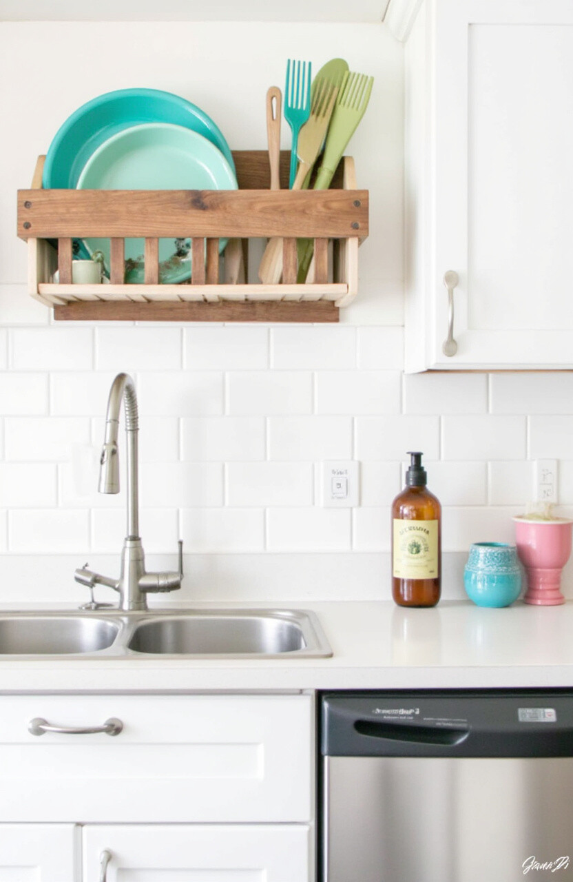 Free up counter space by going vertical! A wall-mounted dish holder is perfect for small kitchens.