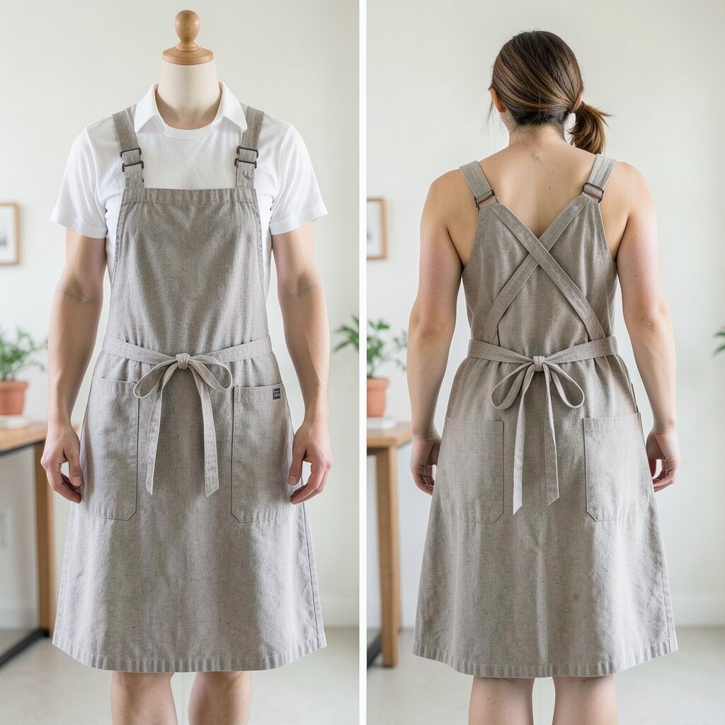 This apron style is sleek and modern, with no ties to worry about. The cross-back design ensures it stays in place comfortably.
