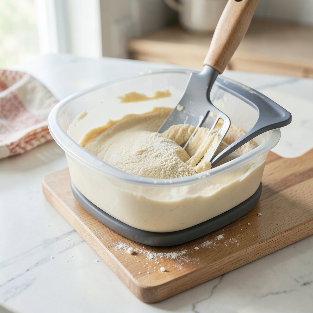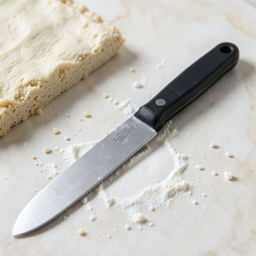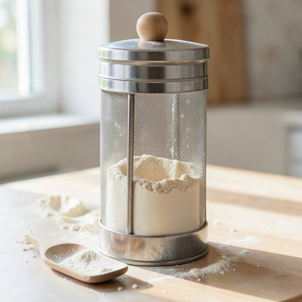 Dust your workspace with ease using a scraper that includes a built-in flour sifter. It’s a handy tool for preparing your surface.